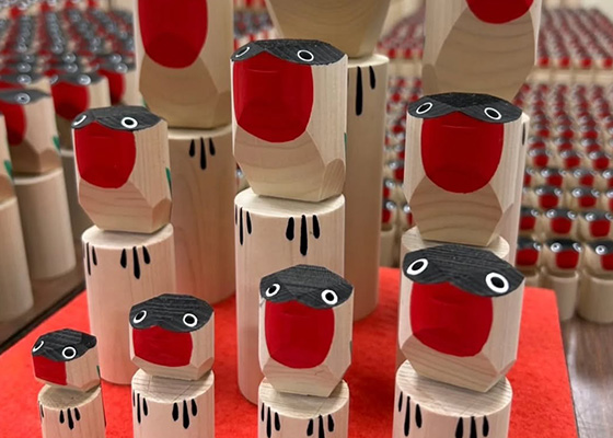 1.2025年11月に改装を終えたばかりの御本殿。背後には東京スカイツリー®がそびえ、江戸・東京の新旧を象徴する風景が見られます。御本殿の左右では紅梅や白梅が咲き、菅原道真が左遷になった際、京都から大宰府へ飛んだといわれる飛梅伝説を感じさせます 2.過去に行われた鷽替神事の様子。木彫りの鷽は1体1体、神職の手によって作られます 3.御本殿横の社務所でいただける多彩な授与品 4.亀戸天神社の手水舎は、亀をかたどった姿。手や口をよりいっそう、清められそうです。御本殿の右手前にあります 5.亀戸天神社の鷽替神事にちなみ、街なかには各所に鷽をかたどったオブジェが点在しています。写真は天神社のある蔵前橋通りの歩道に並んだ歩道の柵の鷽