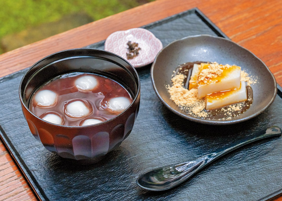 1.イートインメニューのなかで冬におすすめは、温かい白玉しるこ1110円(ミニくず餅付き) 2.くず餅の植物性乳酸菌がたっぷりな、テイクアウトしたい飲むくず餅乳酸菌375円(150g)~ 3.重厚感漂う店内