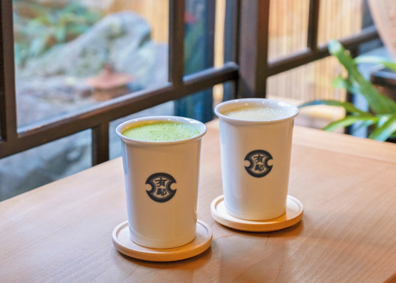 1.ドリンクのなかでおすすめの抹茶ラテとほうじ茶ラテ各550円 2.お土産にしたい有鄰 和紅茶720円、有鄰 やぶきた1080円、矢野園オリジナルの巾着袋1500円も販売 3.現在の建物は大正5(1916)年に建てられた市指定重要文化財。店舗奥側には明治期建造の蔵もあります