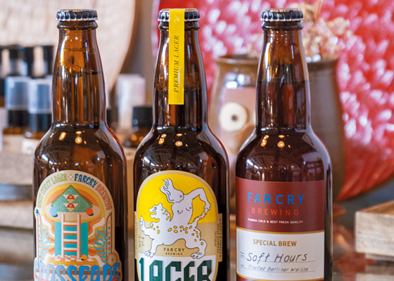 1.自家醸造のクラフトビールは2階ショップでも販売 2.数種類のランチプレートの中でもおすすめは、ジャマイカの伝統的なスパイスに漬け込んだジャークチキンプレート1200円 3.3階のショップフロア。旅をテーマにしているだけに、ユニークな地球儀のオブジェが目を引きます 4.FARCRY BREWINGのクラフトビールは800円~