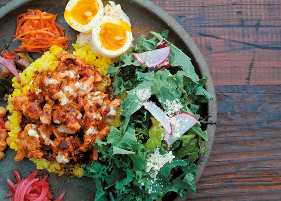 1.木が多用された店内 2.さまざまな陶器が並ぶ店舗の入り口側 3.週替わりのカレー。写真はチキンスパイスカレーサラダ付き1000円(ドリンクセットで100円引き)