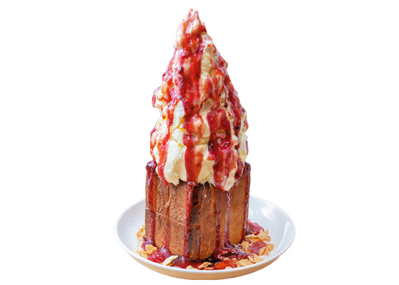 最後に紹介するグルメスポットは、“デカ盛り”の聖地として名を馳せる「キッチン・マカロニ」。「桐生は量の多い飲食店が多く、それに慣れているお客さんにあわせているうちにどんどんと大きくなって……」と店主が語ったように、デカ盛り文化が広まった桐生らしいメニューがそろっています。なかでも、食パン1斤のうえに、たっぷりのアイスクリームがのったインパクト大のハニートーストが名物。アイスクリームの量を選べますが、1ℓ、2ℓ、3ℓといずれもビッグサイズ。複数人でシェアするのがおすすめです。