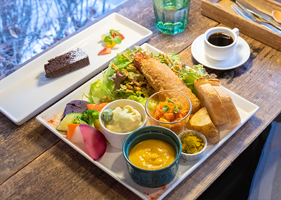 根古屋路地の最奥に位置する、動物性食材を使わないヴィーガン料理のカフェ。おすすめのサラダプレートは、旬の野菜のおいしさが実感できるよう工夫された、料理の技が光るメニュー。メインの大きなニンジンフライは素材の甘さが味わえるお店の名物です。