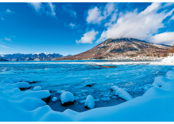 1.普段は滅多に凍ることのない中禅寺湖だが、雪が降った翌日のこの日、水面をたくさんの氷が覆っていた 2.憾満ヶ淵の並び地蔵は、数えるたびに数が異なるとのことから、別名「化け地蔵」とも呼ばれている 3.雪に覆われた桟橋が美しい、早朝の中禅寺湖千手ヶ浜。冬季はバスの運行がないため、アクセスは徒歩のみとなる 4.霧降高原キスゲ平園地の雪原で眺める月の美しさは格別。雪の歩道は非常に滑るため、軽アイゼンがあるとベスト 5.雪のやんだ早朝の二荒山神社・神橋。周囲は幻想的な薄紅色の静寂に包まれる。昼間の喧騒が嘘のように― 6.冬の強い西風により湖水が岸辺の木々に付着して凍りつく自然現象のしぶき氷。足元は凍っているのでご注意を 7.1916年、ジェームズ・ガーディナーの設計によって造られた教会。世界遺産「日光の社寺」の近くにたたずんでいる 8.凍結した竜頭の滝は、冬の絶景スポット。冬は人影もまばらな静かな雰囲気に