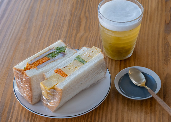 1.サンドイッチ(手前)2個セット990円。つぶし梅ソーダ(奥)550円。地元産のこだわり卵を使った卵焼きや季節の野菜マリネ、寄居名産の豚肉味噌漬けの2種 2.うまみ豚汁830円。地元で飼育されたブランド豚・武州豚のほか、季節の野菜がたっぷりと入った自慢のひと品。 3.かたいプリン550円。卵焼きと同じ地元産の卵を使った、昔ながらのしっかり食感のプリン