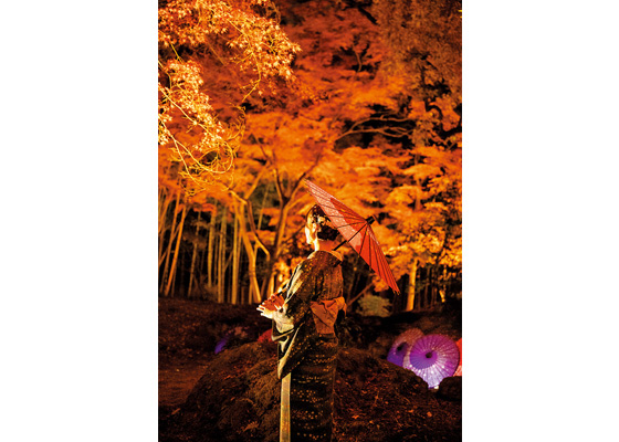 1・2.雀宮公園で紅葉の最盛期に行われる夜間ライトアップの様子。和服や和傘を持参して、写真映えする1枚を撮影するのもおすすめ。夜間ライトアップの実施時期等は事前に寄居町公式HPなどで要確認 3.園内にかかるもみじ橋と紅葉の昼間の様子。落ち葉を踏みしめながら歩くのが気持ちいい散策路が整備されている