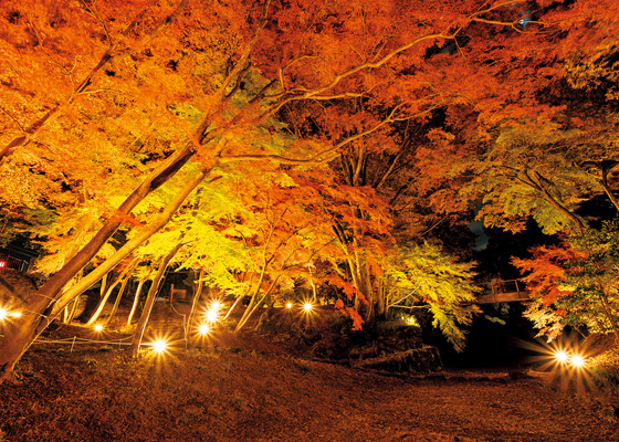 紅葉が最盛期を迎える11月下旬から12月上旬は、葉が色鮮やかな昼間と、日が沈み始めた後の2回訪れるのがおすすめ。夕刻以降は園内各所がライトアップされ、昼間とは異なる幻想的な紅葉風景が楽しめます。「京都の保津川に劣らぬ」と評し、歌舞伎の名優・七代目松本幸四郎丈が別邸を構えた地だけに、京都を思わせる雅な秋の風情を感じられるはず。荒川を渡る正喜橋から全景を眺めると、紅葉の木々が明かりに照らされて燃えるような赤一色の世界を眺めることができます。