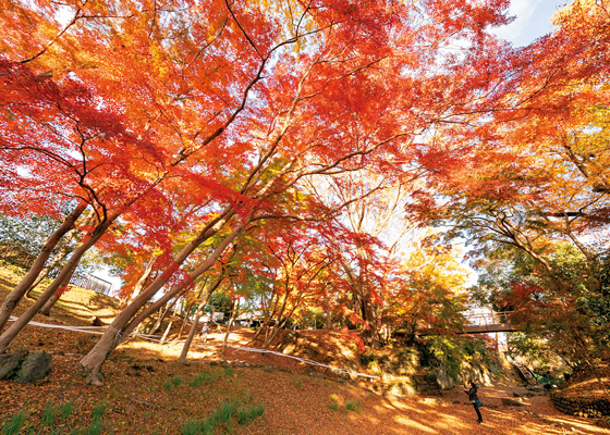 明治から昭和にかけて活躍した歌舞伎役者・七代目松本幸四郎丈がこの地の風景を好み、別邸を構えた場所を整備した公園。荒川沿いの断崖絶壁の上に広がっていて、赤く色づいたカエデ類の木々が織りなす美しい風景が広がっています。園内からは、清らかな水が流れる荒川のほか、戦国時代の代表的な城郭跡・鉢形城跡、秩父の山々を望むこともできます。