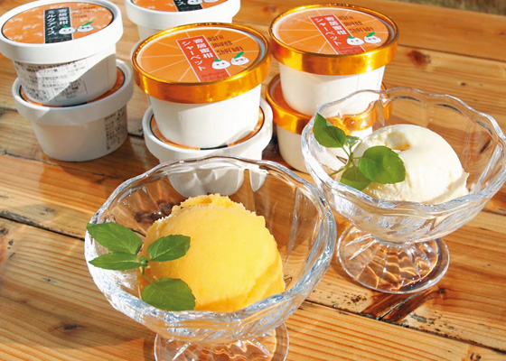 1.寄居みかんシャーベット380円(手前左)。寄居みかんミルク味380円(手前右)。「戦国 寄居みかんアイス」の名で親しまれている、寄居特産のみかんを使った、シャーベット状とクリーム状の2種のデザート