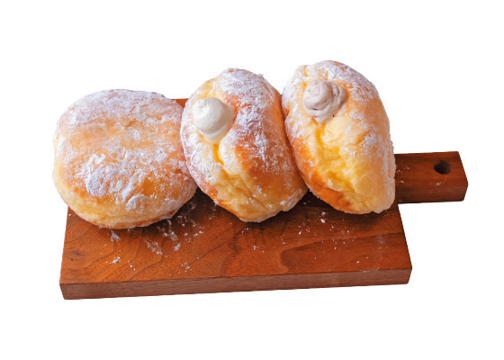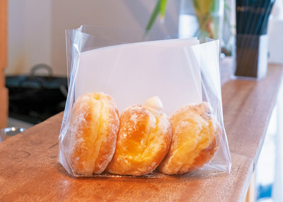 1.プレーン・生ドーナツ・新作ドーナツ3個セット1100円。ふわふわ&もちもち生地が絶品のドーナツは、3個セットを袋入りで販売。 2.左がクリームなしで生地のおいしさが感じられるプレーン、中央が生乳100%のクリーム入りの生ドーナツ、右が新作ドーナツ(写真は小倉)