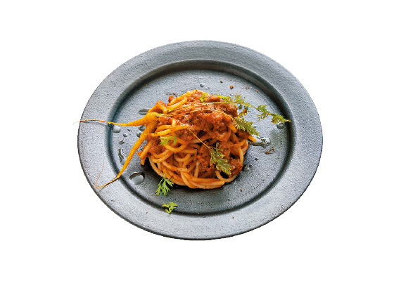 1.オーガニックコース(パスタ)※コース内料金。選べるパスタのうち、鹿肉のミートソースパスタ。間引きした葉付きニンジンを素揚げして上に添えて 2.オーガニックコース(野菜たっぷりの前菜)※コース料金内。季節の野菜をさまざまなアレンジで楽しめるプレート。この日は低温調理した、柔らかい鹿肉も 3. 1.と2.の2種のほか、本日のデザートと飲み物が付くオーガニックコース3190円。パスタは全4種と日替わり1~2種のなかからセレクトOK