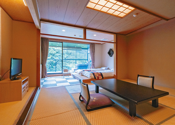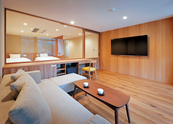 - 1.露天風呂付き客室のひとつ、蔵をモチーフにした和洋室の栃-TOCHI-。ベッドはツインのローベッド。窓の外に見える木々に癒されます