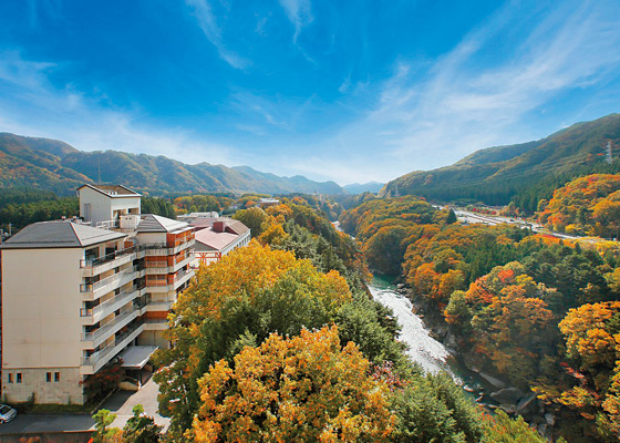 - 2.上空から見た栂の季と鬼怒川渓谷の秋の風景。色鮮やかな渓谷沿いの秋