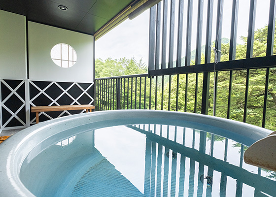 - 3.和洋室・栃-TOCHI-の露天風呂は、屋外にあるなまこ壁の白黒のデザインが大人の雰囲気を演出