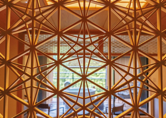 - 4.栃木・鹿沼の伝統工芸である鹿沼組子をあしらった和モダンな内装の和洋室・梔の間