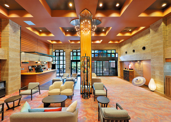 名前の由来となったのは、エントランス前にそびえる樹齢700年ほどという栂の木。大樹に見守られながら入り口を進むと、旅館らしい和のしつらえが目を引く温もりある空間が出迎えてくれます。