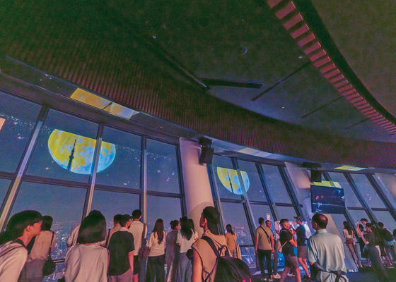 東京スカイツリー®の地上350mに位置する天望デッキは、360度のパノラマが眺められる展望スポット。国内外から昼夜を問わずに多くの人でにぎわいますが、限られた特別な日だけに開かれる“バー”があるのをご存じでしょうか?その名は「満月に開く秘密のBar」。毎月、満月の前後の夜にだけ、月にまつわる特別なドリンクが提供され、満月をモチーフにした幻想的な映像も上映される、実にロマンチックな時間が過ごせる特別イベントです。