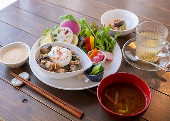 さらに、ほんとうに健康的な食事とは何かを多角的に追求し続けているのも舘内さんの強い思いがあってのこと。自宅ではなかなか難しい8大栄養素のすべてを摂取できて、自家製の食材も多い発酵食品も多用したメニューを提供。周囲の田畑で採れた野菜をはじめ、ひとつのメニューで15品以上の野菜が使われていて、“生”、“蒸す”、“煮る”など多彩な調理法で仕上げられています。ランチは6種類のメニューがあり、他ではお目にかかれない健康的な創作料理が味わえます。