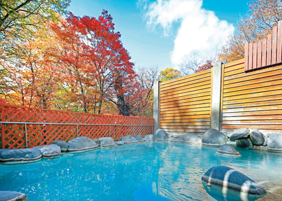 - 5.乳白色の湯が満ちた露天風呂「空ぶろ」。森が目の前に広がり、湯は源泉かけ流し。木の温もりと森を感じる空間