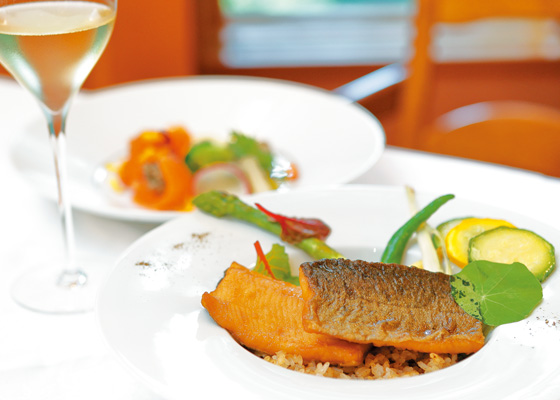 地産地消を心がけた夕食は、金谷ホテル伝統を受け継いだ品々。和食の要素を取り入れた、地元産のニジマスを使った料理が名物です。