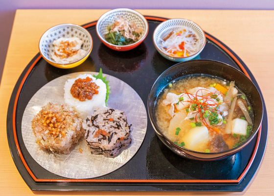 田ノ実プレートは、花むすび2個セット1650円、3個セット(写真)1760円。写真のお汁はまろやかなお味噌の豚汁