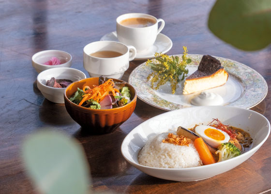 ランチメニューは、季節ごとに変わる全3種類。内容が変わるカレーのほか、春から秋にかけては野菜をふんだんに使ったサラダブレッドが看板メニュー。手作りスイーツも人気で、こちらも季節ごとに内容が変わるチーズケーキがおすすめです。