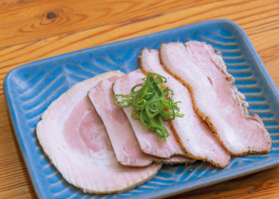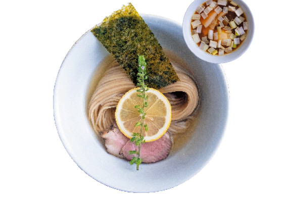 麺は国産小麦を使った中細タイプ。小麦の香りとしっかりとした歯ごたえが後を引くおいしさです。具はレモン、穂紫蘇、海苔のほか、肩ロースの吊るし焼きチャーシューが麺にのり、つけ汁にはバラの吊るし焼きと煮豚、味玉が入ります。