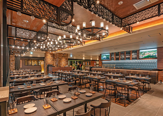 こんなコンセプトを掲げるのが、全国に4店舗を構える世界のビール博物館です。ソラマチ7Fにあるこちらでは、樽生だけで100種類を超える世界中のビールを提供していて、カウンター前に並んだビアタップがシンボル的な存在。350席を超える広々とした店内にはテラス席もあり、春から秋に人気を集めています。