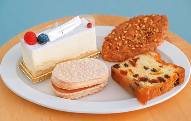 写真左がレアチーズケーキ540円。右上の石神井川のリーフパイ216円など、焼き菓子も豊富です。
