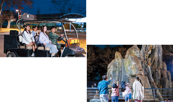 ドームテント「アドベンチャー・ドーム」宿泊者限定のアクティビティとして、閉園後の園内を電動カートに乗り、飼育係の音声ガイドで巡るツアー「アドベンチャー・ナイト」をオプションでご用意しております。また、愛犬と宿泊可能な「シンフォニー・ヴィラ」では、最大約950㎡を超える大型プライベートドッグランや専用BBQ設備を併設しており、愛犬との絆を深めるひとときをお過ごしいただけます。日常では味わえない感動や動物の息づかいを間近に感じ、ここでしかできない体験をぜひお楽しみください。