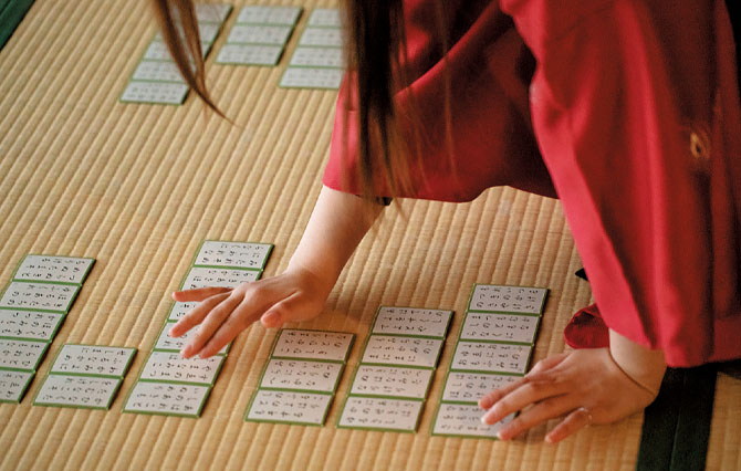 小倉百人一首を使って行う頭脳スポーツです。百人一首の100枚のうち、半分の50枚を使って1対1で戦います。まず下の句の札を自陣(自分の前)に25枚、相手陣(相手の前)に25枚それぞれ並べます。読手(どくしゅ)が読む上の句を聞いて、相手陣の札を取ると自陣の札を1枚相手に送り、逆に自陣の札を相手に取られると相手から1枚札を受け取ります。そして先に自陣の札を0枚にした方が勝ちです。