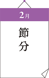 季節を表す二十四節気(にじゅうしせっき)は、1年を春夏秋冬の四季に分け、さらに各季節を6つに分けたもので、2月の立春から始まります。節分は立春の前日を指し、新たな季節を迎える際に邪気を払う行事を行います。今年の節分は2月3日。節分といえば豆まきですね。節分には邪気=鬼が現れるとされ、「魔(ま)を滅(め)する」という意味で豆をまきます。豆まきの始まりがいつ頃かは明確ではありませんが、南北朝時代には「鬼は外、福は内」と唱えて豆をまいていたようです。
