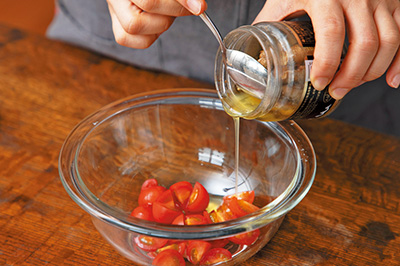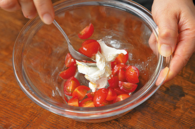 1. ミニトマトは1/4にカットしてボウルに入れ、オイルサーディンのオイルを注ぎ入れたら、その他の★も加えてよく混ぜる。