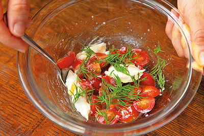 3. ディルは葉を手でちぎり、飾り用の4枚を別にとっておいて、残りの葉は全て2に加えて混ぜる。