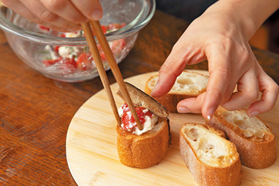 4. バゲットは表面に焼き色がつくまで焼き、3とオイルサーディンをのせたら、ディルを飾って完成。