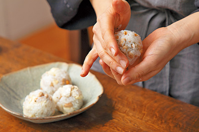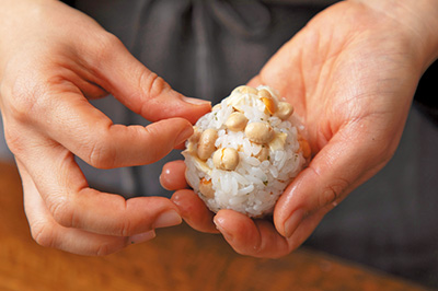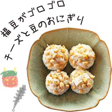 4. おにぎりの表面に、トッピング用の福豆をやや押し込むように飾って完成。
