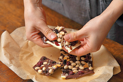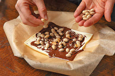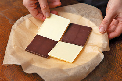 1. 板チョコレートをオーブンシートに交互に置き、1枚の板になるように並べる。