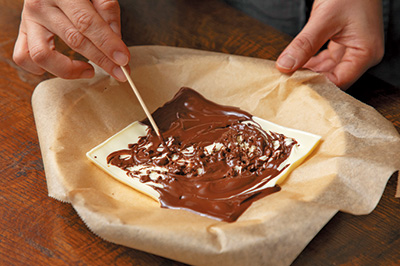 3. チョコレートがやわらかいうちに串などでマーブル模様を描く。