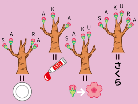 - それぞれの木のつぼみが、木の下にあるイラストを表す文字に対応しているようです。