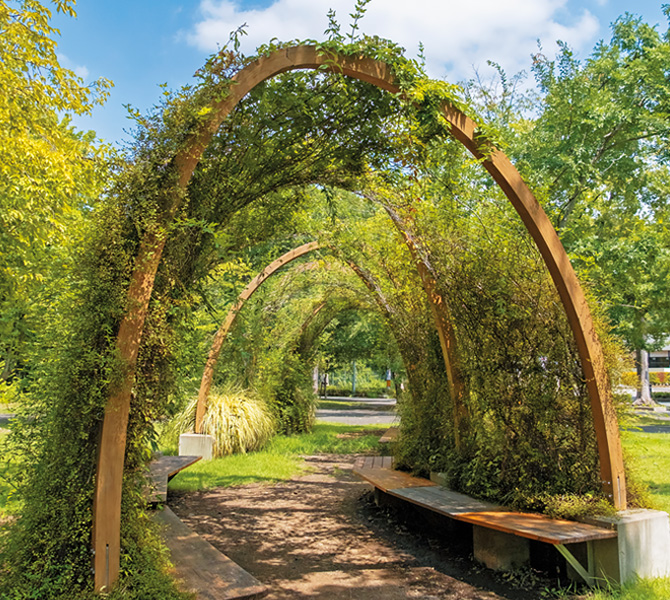 朝霞駅の南口から歩いて10分ほどの公園通りにある木かげのトンネル。つる性植物が覆うアーチ型のトンネルで、自然と一体になったアート作品のような姿が目を引きます