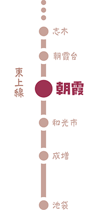 - 朝霞駅から新座栄行きバスで3分、第四中学校入口下車、徒歩5分