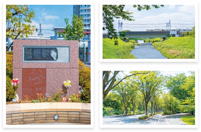 (写真左)朝霞駅南口にある、幼いころから亡くなるまでこの街に暮らした本田美奈子.さんの歌碑