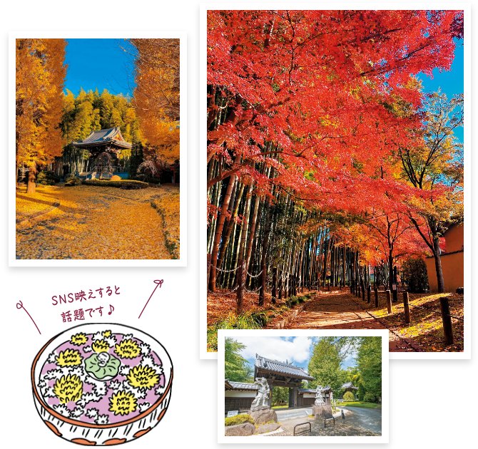 まず訪れたいのが、真言宗智山派の寺院である東圓寺(A)。山門周辺に植えられたイチョウの木々が黄葉し、落ち葉で黄色いじゅうたんを敷き詰めたような美しい秋の風景に迎えられます。山門右手に続く竹林の小径(こみち)・奥之院参道もまた、道沿いのモミジが真っ赤に色づき、京都・嵐山を思わせるような雅(みやび)な世界が広がります。
