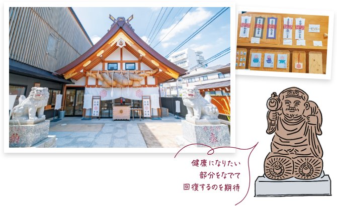 (イラスト右下)境内にあるみがわり大国主大神の像。体の不調なところや気になったりするところをなでると、ご利益があるといわれています