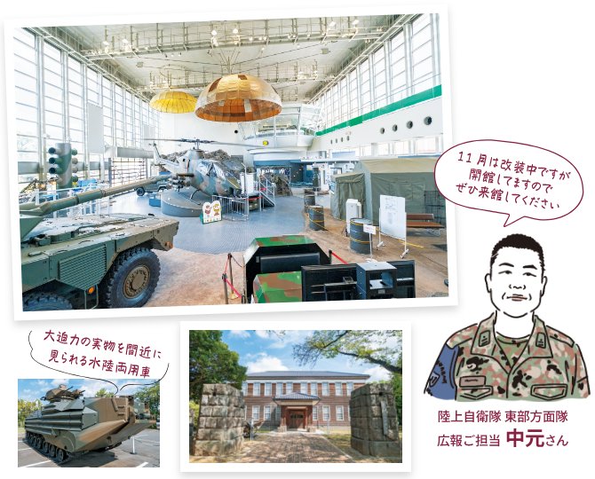 続いて向かうのは、駅南口から路線バスが近くまで運行しているりっくんランド(C)。陸上自衛隊広報センターであり、その歴史や現在の装備・戦闘車両などを間近に見ることができます。2025年9月から全面改装が始まっていますが、この11月はVRによる訓練体験や屋外の車両の見学は可能。昭和16(1941)年から終戦まで旧陸軍予科士官学校が置かれていた歴史から、神奈川県座間市にあった旧陸軍士官学校皇族舎を昭和53(1978)年に広報センターの隣接地に移築。振武臺(しんぶだい)記念館として、貴重な旧陸軍の史料などを展示しています(改装の対象外)。