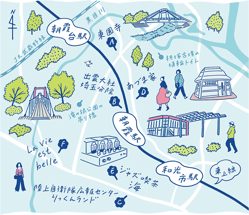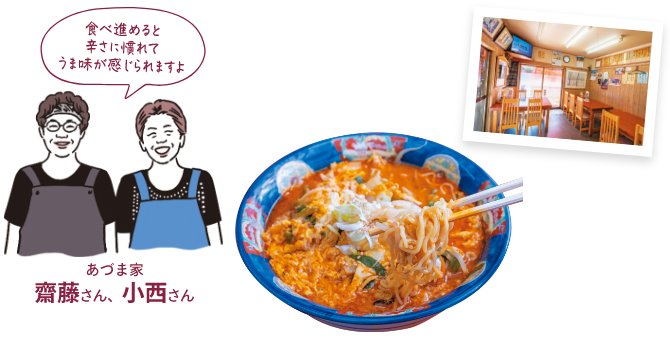 駅東口から歩いて8分ほどのあづま家(D)は、朝霞の名物グルメとして大人気のテフタンメンが食べられる唯一のお店。辛味とうま味が融合した野菜たっぷりの麺料理は、他では味わえない唯一無二のおいしさです。
