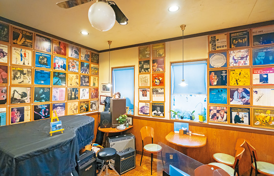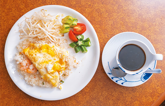 朝霞駐屯地が米軍基地だった昭和27(1952)年に開店。往事は米兵が着飾って訪れ音楽に耳を傾けたという、町とともに歴史を刻んだ名店です。希少な真空管アンプの音は今なお健在。写真はえびピラフ1120円とオリジナルブレンド550円。