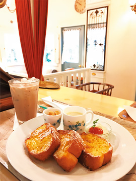 住宅街にひっそりとたたずむカフェ。店名はフランス語で「人生は美しい」。オーダー家具職人の金杉さんがつくり上げた、欧州の洋館を思わせる店内でくつろげます。サンドプレートやクロワッサン、フレンチトースト(写真)やスイーツがそろっています。