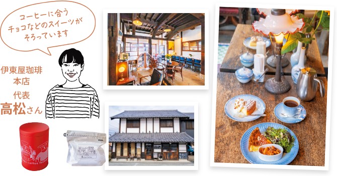 歴史的な建物を使った古民家カフェも駅北西に見つけました。新潟県糸魚川市にあった築150年以上の古民家の梁や柱を移築した、レトロで温もりある空間が広がる伊東屋珈琲 本店(B)です。コーヒーに使われるのは、桐生市中心部にある支店で自家焙煎した、世界各国から厳選したスペシャルティコーヒー。自家製ケーキやキッシュプレートなどのフードメニューとともに、高品質なコーヒーが味わえます。かわいいイラストが描かれた豆の保存缶などもそろっています。