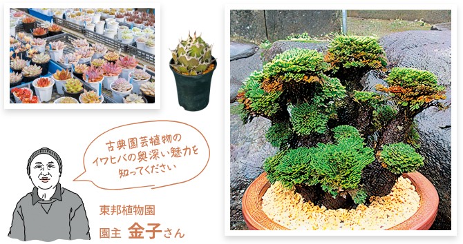 (写真右)江戸末期から盆栽として愛されてきた古典園芸植物と呼ばれるイワヒバ。斑入葉や葉変わりなど、金子さん渾身の作品がそろっています